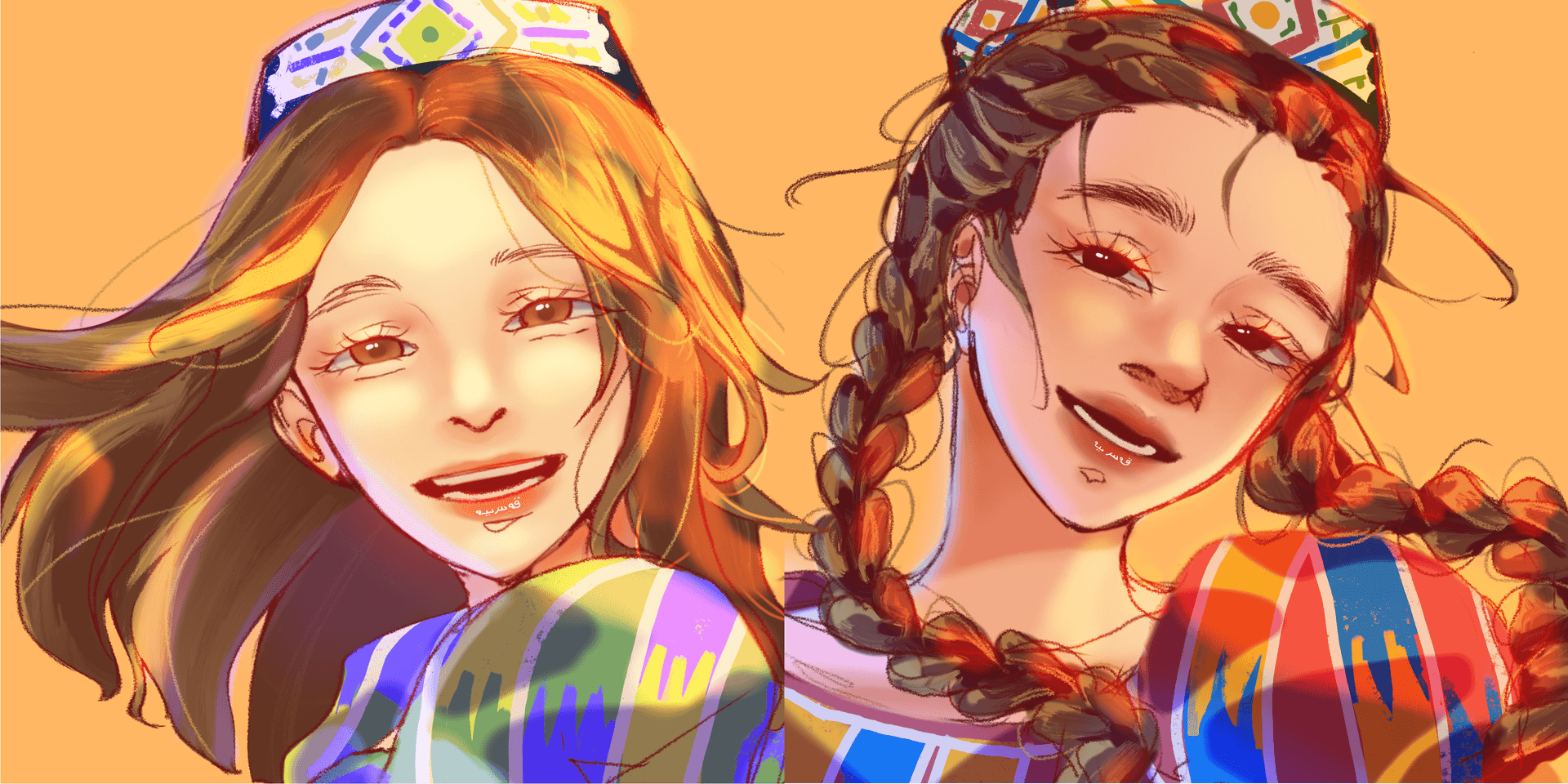 At Nowruz, that disconnect was bridged; I felt like I was Uyghur again. Seeing my sisters dance made me realize the beauty in our culture and how I must try my best to preserve it. Even now, the memory of their smiles and laughter lingers in my head, inspiring me to carry on this memory and draw it. I wanted to capture the moment; the happiness my sisters had on their faces as they danced and spun in their fluttering etles dresses would live on forever. My sisters, Kawsar and Jawhar, mean so much to me. Every time I'm around them, I finally feel Uyghur.